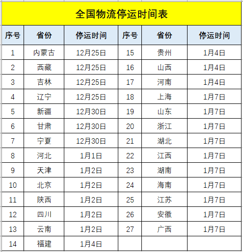 由于天氣寒冷以及霧霾天氣嚴重,今年全國物流停運時間比往年來得早。基于國家交通部、物流部等部門發出的通知,距離物流停運時間不多了,部分區域物流將于1月5日開始陸續放假停運,1月18日將全國大范圍停運。